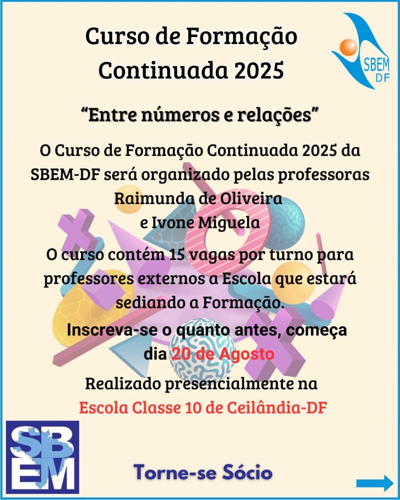 A SBEM-DF juntamente com as professoras Raimunda de Oliveira e Ivone Miguela está organizando o Curso Entre Números e Relações, Curso de Formação Continuada para professores que ensina por meio da Matemática.