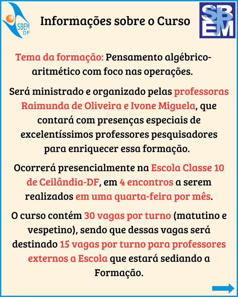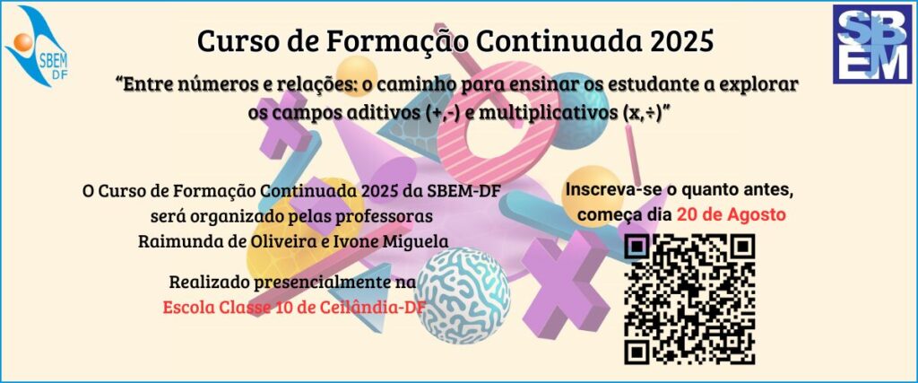 A SBEM-DF juntamente com as professoras Raimunda de Oliveira e Ivone Miguela está organizando o Curso Entre Números e Relações, Curso de Formação Continuada para professores que ensina por meio